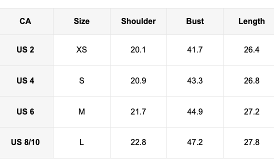 Sizes available are XS-Large